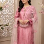 This elegant 3-piece unstitched katan silk suit is perfect for Pakistani women who want to look stunning for weddings, parties, or festive occasions without the hassle of stitching. The soft pink hue and delicate floral embroidery on the dupatta add a touch of grace, while the durable katan silk ensures comfort and longevity. Ideal for summer and warm weather, this stylish ensemble combines traditional design with modern flair, making it a smart investment for your wardrobe. The shirt and trousers are crafted from premium quality katan silk, known for its smooth texture and breathability, ensuring you stay cool and comfortable. The dupatta, made from lightweight net fabric, drapes beautifully and adds a graceful flow to your look. This set is not only fashionable but also durable, making it suitable for both casual outings and formal events. The plain design allows for versatile styling, while the subtle embellishments elevate its elegance. – Made from premium quality katan silk for comfort and durability – Includes 1 shirt, 1 trouser, and 1 dupatta in a coordinated pink set – Dupatta features delicate floral embroidery for added charm – Perfect for weddings, parties, and festive occasions – New arrival with best price in Pakistan for exceptional value – Stylish design suitable for both traditional and modern settings